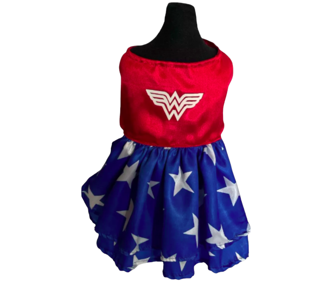 ¡Convierte a tu perrita en la guerrera más valiente y adorable del universo con este increíble Disfraz de Mujer Maravilla de la marca JARKAR! Ideal para perritas con espíritu fuerte, este vestido es perfecto para Halloween, convenciones, fiestas de superhéroes o simplemente para pasear derrochando poder y estilo.